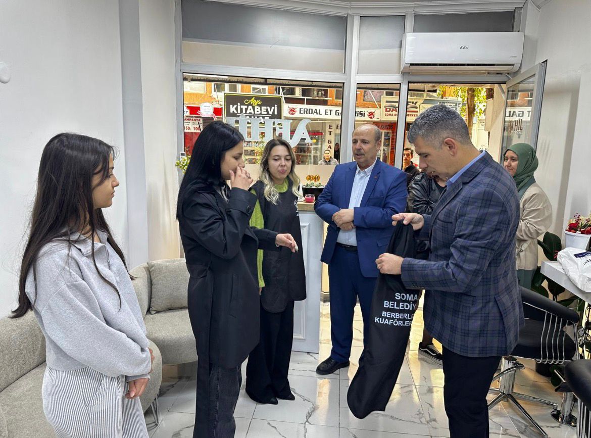 Soma Belediye Başkanı Sercan Okur, Berberler ve Kuaförler Odası Başkanı Ali Örs ile birlikte ilçede faaliyet gösteren berber ve kuaför işletmelerinin bir kısmını ziyaret ederek, özel olarak tasarlanan önlük hediye etti.