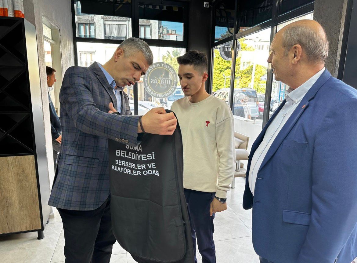 Soma Belediye Başkanı Sercan Okur, Berberler ve Kuaförler Odası Başkanı Ali Örs ile birlikte ilçede faaliyet gösteren berber ve kuaför işletmelerinin bir kısmını ziyaret ederek, özel olarak tasarlanan önlük hediye etti.