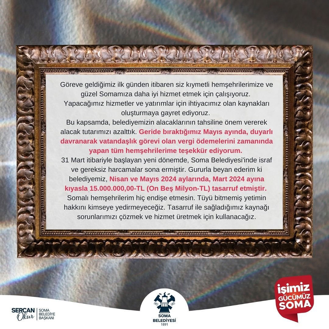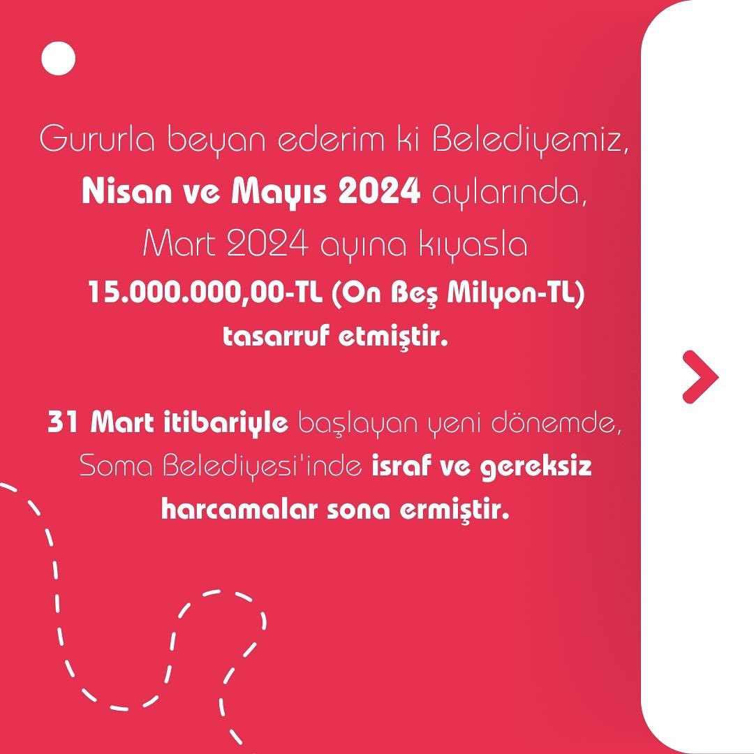 31 Mart itibariyle başlayan yeni dönemde, Soma Belediyesi’inde israf ve gereksiz harcamalar sona ermiştir. Gururla beyan ederim ki belediyemiz, Nisan ve Mayıs 2024 aylarında, Mart 2024 ayına kıyasla 15.000.000,00-TL (On Beş Milyon-TL) tasarruf etmiştir.