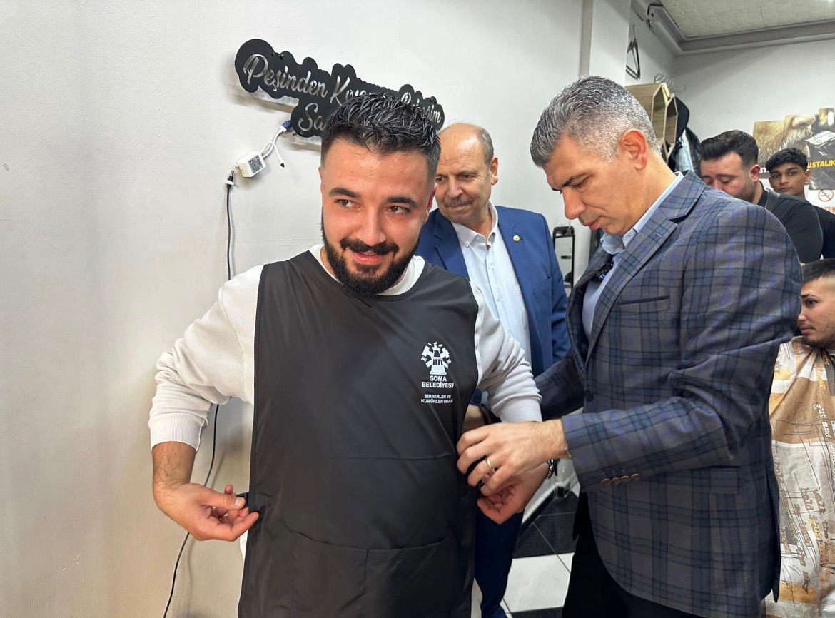 Soma Belediye Başkanı Sercan Okur, Berberler ve Kuaförler Odası Başkanı Ali Örs ile birlikte ilçede faaliyet gösteren berber ve kuaför işletmelerinin bir kısmını ziyaret ederek, özel olarak tasarlanan önlük hediye etti.