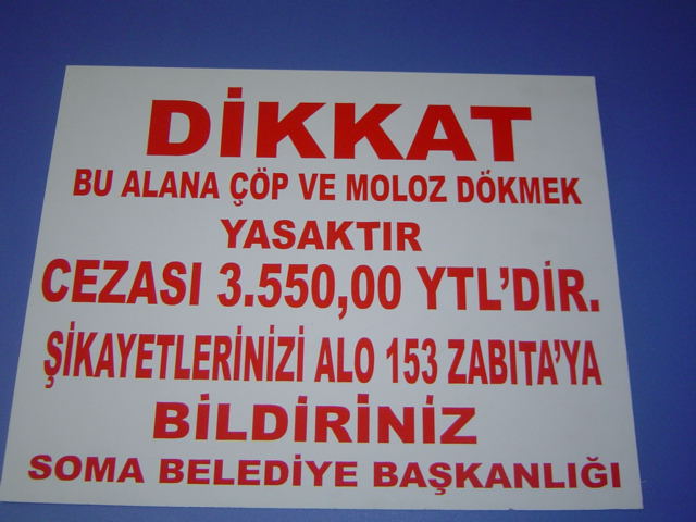 Yetkililer olarak bizler, yine 'Dikkat! Çöp ve Moloz Dökmek Yasaktır. Uymayanlar hakkında İdari ve cezai işlem yapılacaktır' uyarı ve yasak levhalarını ilgili alanlara koyacağız ve bu konuda gerekli önlemleri alacağız ama unutmayalım ki bu şehir hepimizin, 'temiz bir çevre bizlere atalarımızın bıraktığı bir miras değil, çocuklarımıza ve geleceğimize bırakacağımız bir emanettir' düşüncesiyle, vatandaşlarımızı, inşaatla ve hafriyatla iştigal eden firmalarımızı ve kuruluşlarımızı çevre dostu olmaya, Çevrenin korunması, iyileştirilmesi, temizlenmesi, her türlü çevre kirliliğinin önlenmesi ve çevre bilincinin yaygınlaştırılması konularında göstereceğiniz gayret ve yapacağınız çalışmalarla, çevreciliği hayat tarzı haline getirmiş olacağınızdan dolayı bu görüntü kirliliğini önlemede yardım,destek ve duyarlılığınızı ümit ediyoruz.