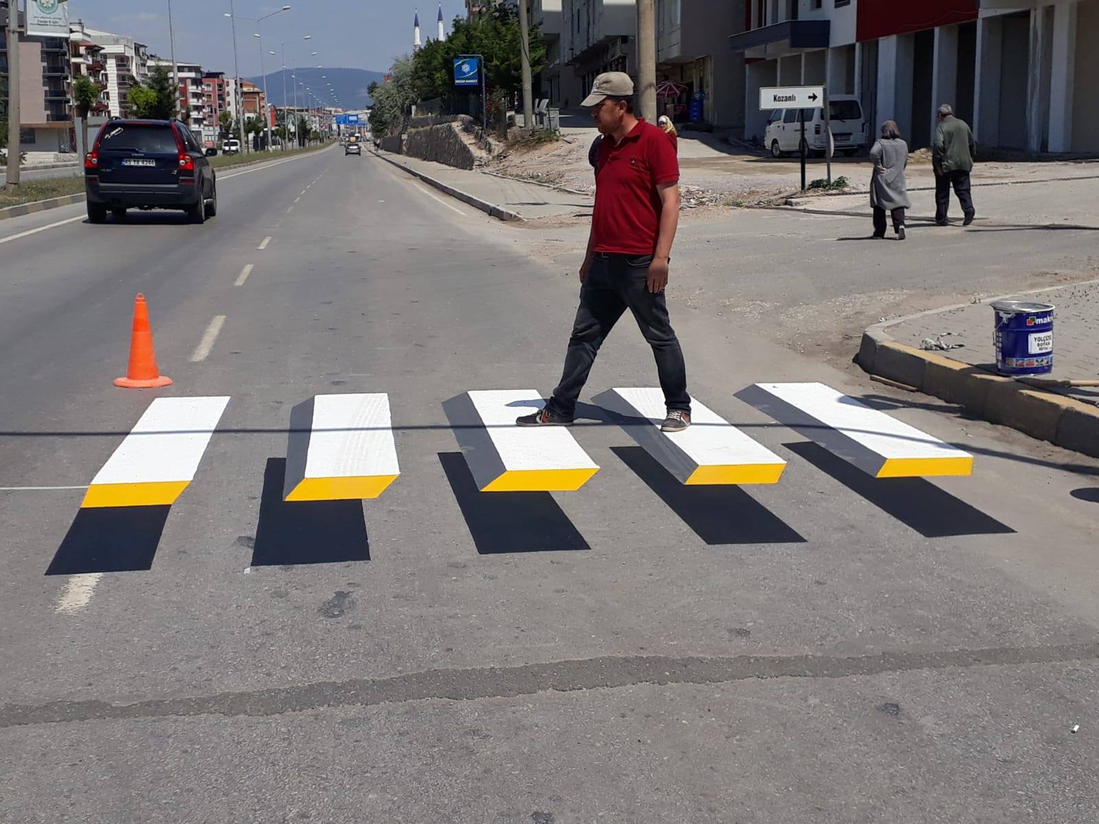 Şehit Ömer Halisdemir Ortaokulu önündeki yolda bulunan "üç boyutlu yaya geçidi"nin diğer bölgelerdeki okul önlerinde de uygulamaya geçirilmesi planlanıyor. Optik yanılsamaya neden olan üç boyutlu yaya geçidi, sürücülerde "yolda kasis bulunduğu" izlenimi uyandırarak araçların yavaşlamasını sağlıyor.