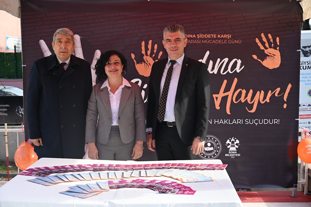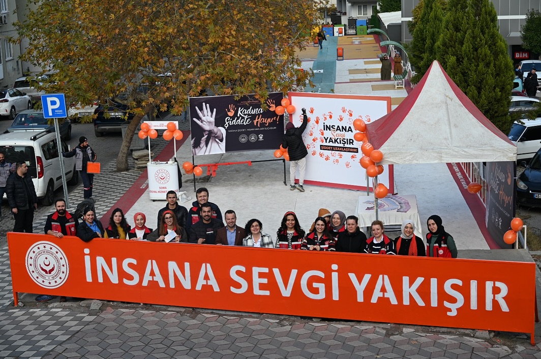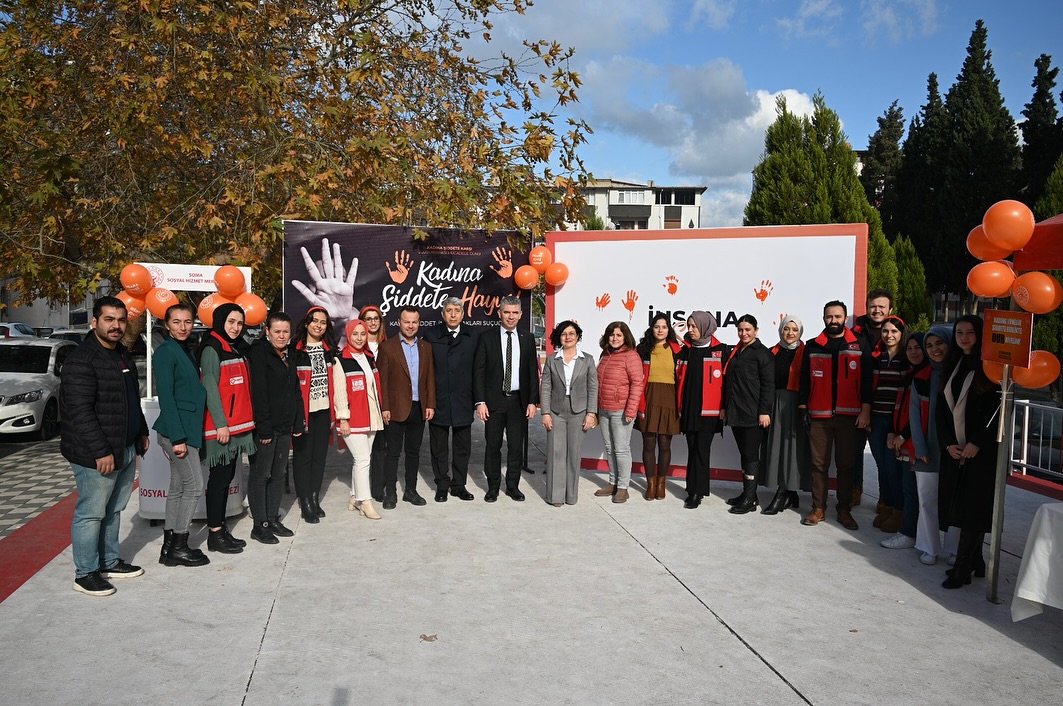 25 Kasım Kadına Yönelik Şiddetle Mücadele Günü kapsamında, Soma Kaymakamlığı’na bağlı Sosyal Hizmetler Müdürlüğü öncülüğünde anlamlı bir farkındalık etkinliği gerçekleştirildi. “İnsana Sevgi Yakışır, Şiddet Uzaklaştırır” mottosuyla düzenlenen etkinliğe Soma Belediye Başkanı Sercan Okur, Sosyal Hizmetler Müdürü, kurum personeli ve çok sayıda vatandaş katıldı.